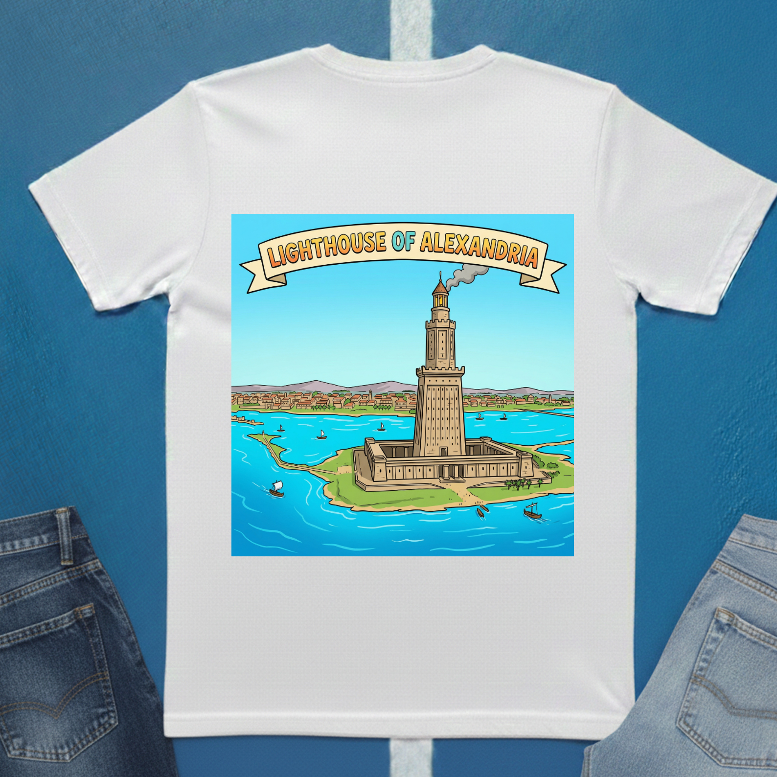 Celebrate one of the legendary Seven Wonders of the Ancient World with this Lighthouse of Alexandria T-Shirt featuring a striking back print inspired by the historic Lighthouse of Alexandria. Perfect for history lovers, mythology enthusiasts, and admirers of ancient architectural marvels.